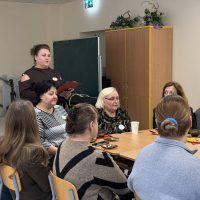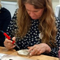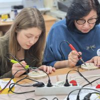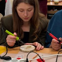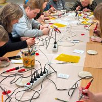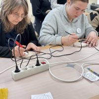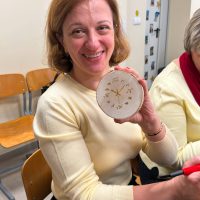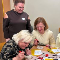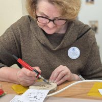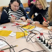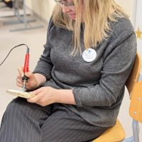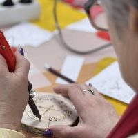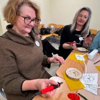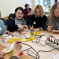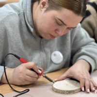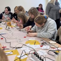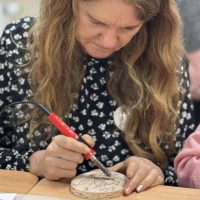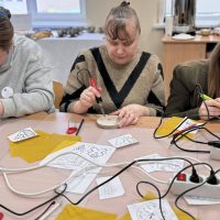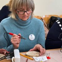 Kūrybinės dirbtuvės „Matematikos kodas: STEAM žinios ir patirtys“. Kol mokiniai sprendė olimpiados užduotis, mokytojai laiką leido ne mažiau turiningai. Pedagogams ir nepedagoginiams darbuotojams skirta veikla persipynė su STEAM metodika. Dalyviai praktiškai išbandė deginimą ant medžio, derindami tikslumą, technologijas ir meninę išraišką. Jų rankose gimė unikalūs padėkliukai kavai ir dekoracijos, kurios nuo šiol puoš matematikos kabinetą. Šis kūrybinis procesas tapo puikiu pavyzdžiu, kaip teorinės žinios gali virsti estetiškais ir praktiškais daiktais, o pokalbiai prie kavos puodelio leido sustiprinti kolegialų ryšį.