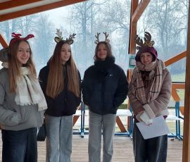 Korzystając z zaproszenia nauczycielki języka angielskiego w gimnazjum im. J. I. Kraszewskiego w Wilnie Olgi Nowickiej i uczniów 8b klasy, 19 grudnia uczniowie 8 klasy naszego gimnazjum wzięli udział w wyjątkowej, świątecznej lekcji terenowej, która połączyła naukę języka angielskiego z aktywną zabawą. Uczestnicy zostali podzieleni na międzyszkolne grupy, co sprzyjało integracji i współpracy między rówieśnikami. Zajęcia zostały zorganizowane w formie siedmiu stanowisk, z których każde oferowało inne zadanie. Na uczestników czekały zagadki językowe, pantomimy, śpiewanie piosenek po angielsku oraz wyzwania sprawnościowe, które wprowadzały w świąteczny nastrój i jednocześnie rozwijały różnorodne umiejętności.