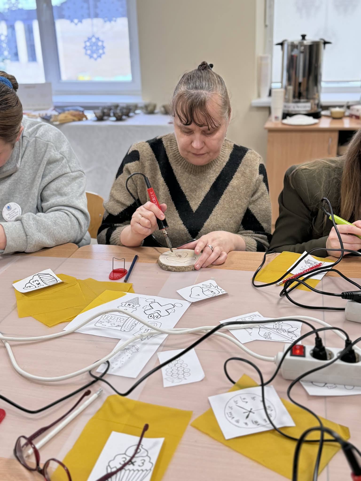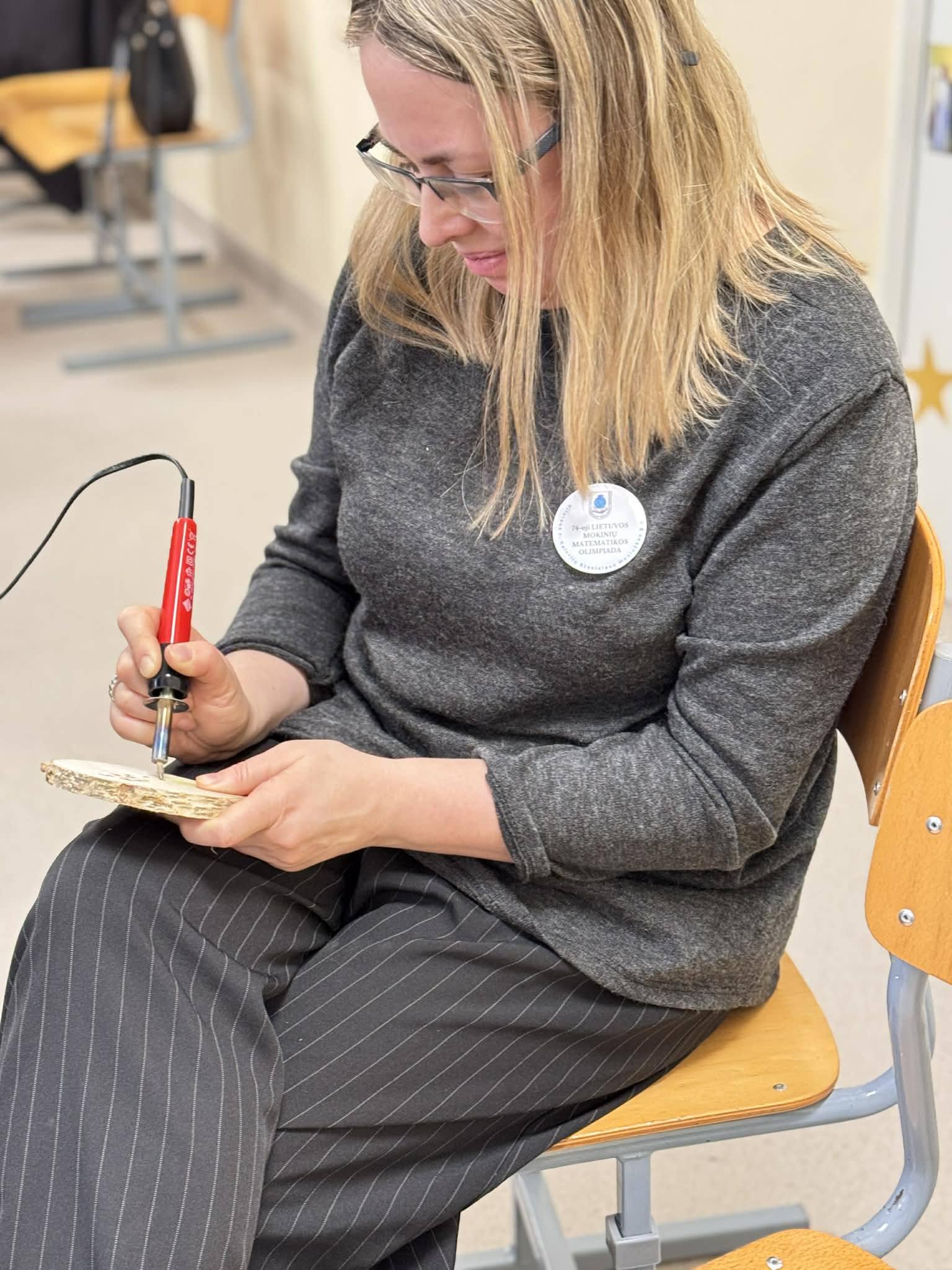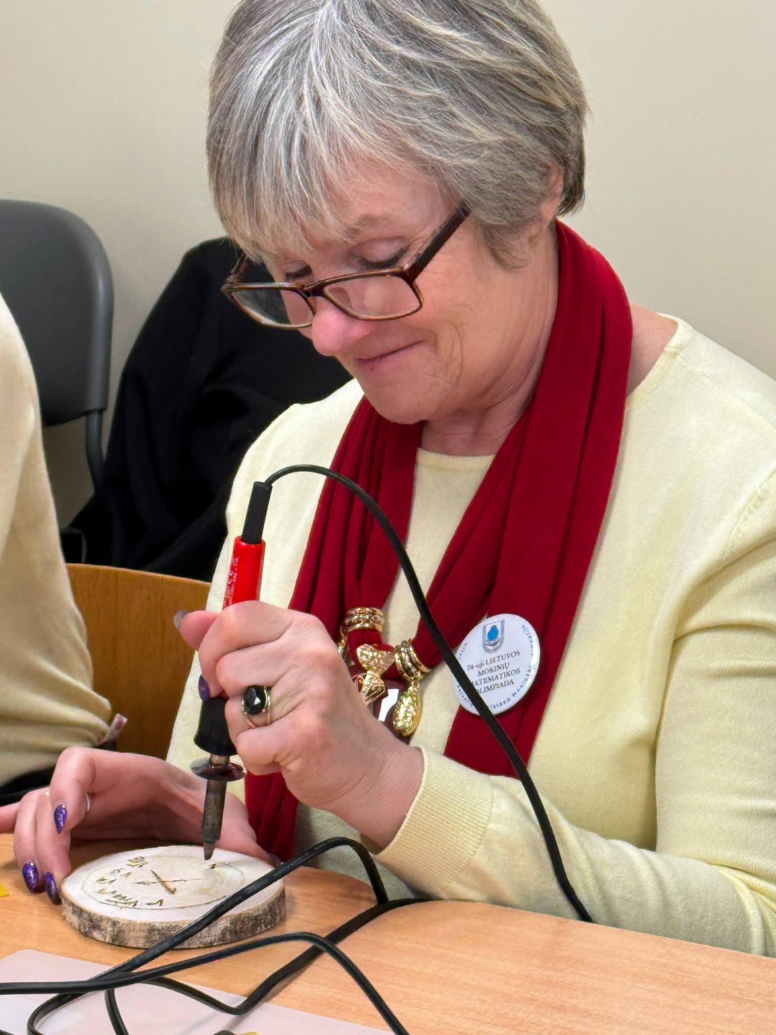 Kūrybinės dirbtuvės „Matematikos kodas: STEAM žinios ir patirtys“. Kol mokiniai sprendė olimpiados užduotis, mokytojai laiką leido ne mažiau turiningai. Pedagogams ir nepedagoginiams darbuotojams skirta veikla persipynė su STEAM metodika. Dalyviai praktiškai išbandė deginimą ant medžio, derindami tikslumą, technologijas ir meninę išraišką. Jų rankose gimė unikalūs padėkliukai kavai ir dekoracijos, kurios nuo šiol puoš matematikos kabinetą. Šis kūrybinis procesas tapo puikiu pavyzdžiu, kaip teorinės žinios gali virsti estetiškais ir praktiškais daiktais, o pokalbiai prie kavos puodelio leido sustiprinti kolegialų ryšį.