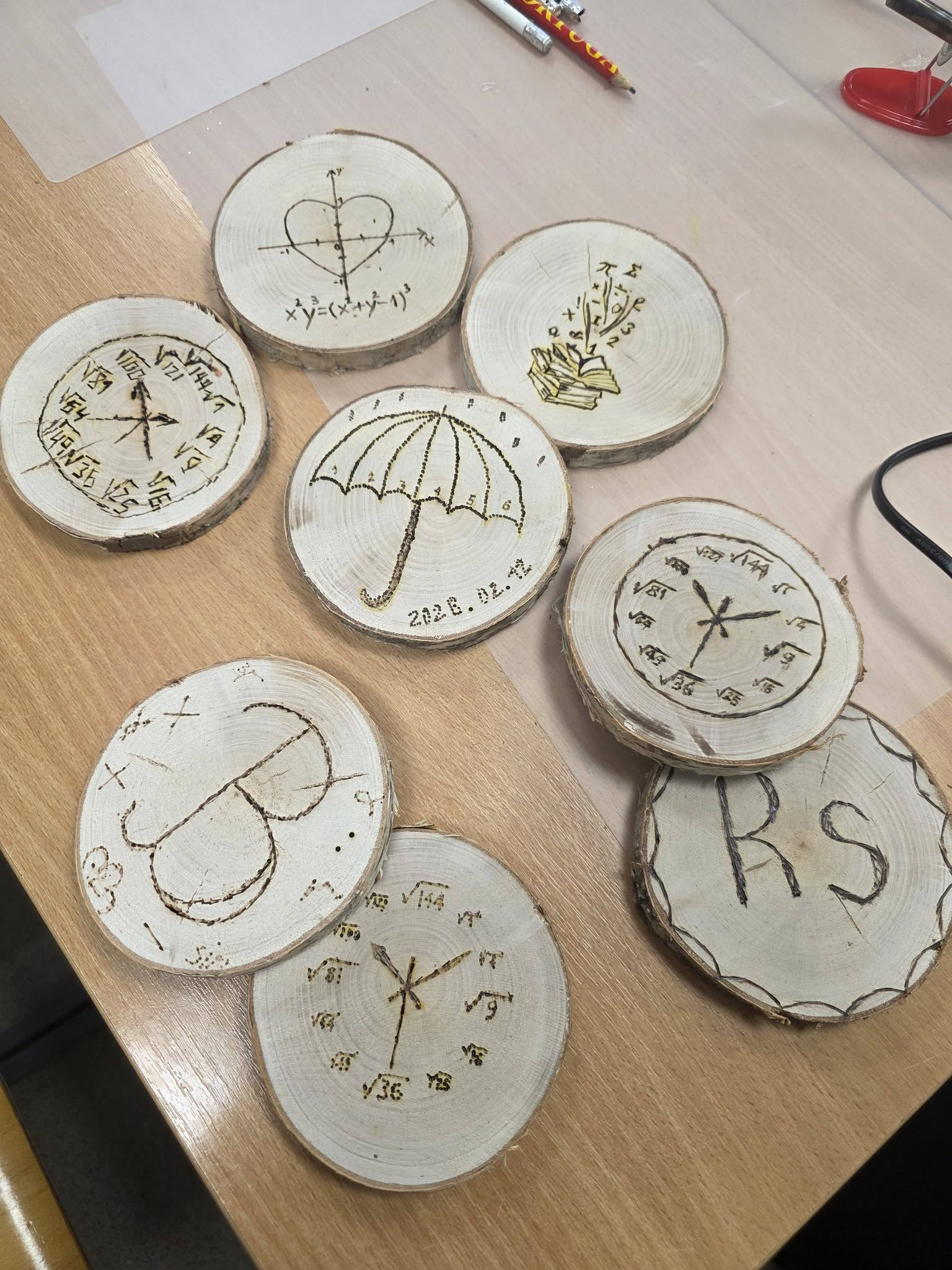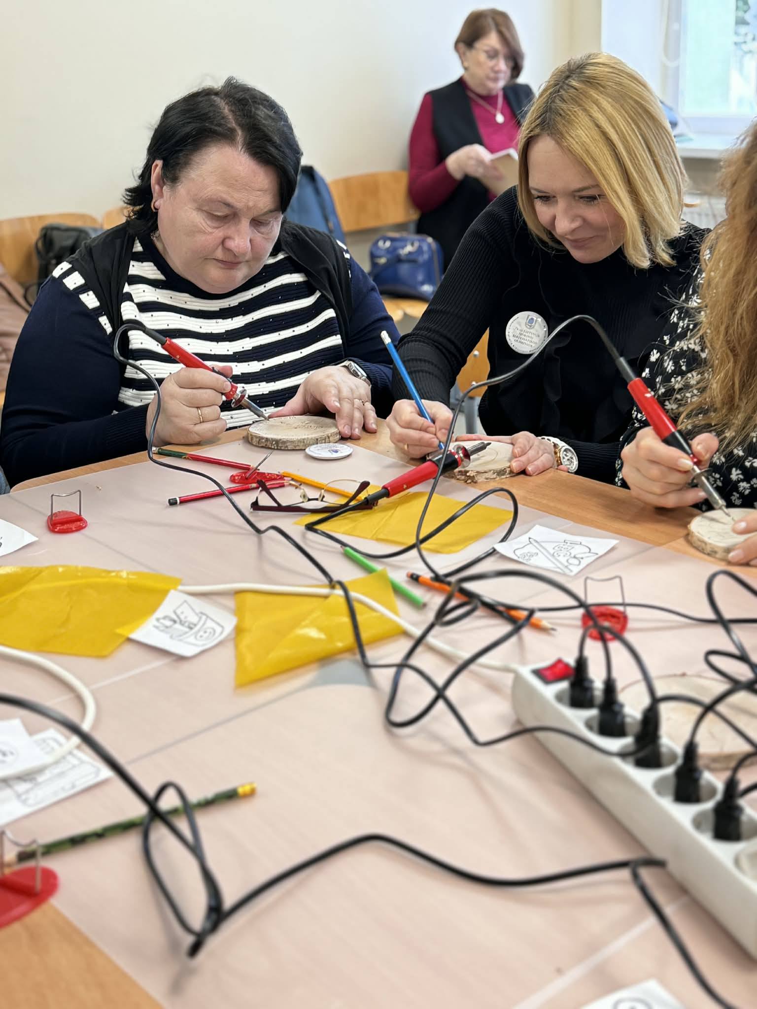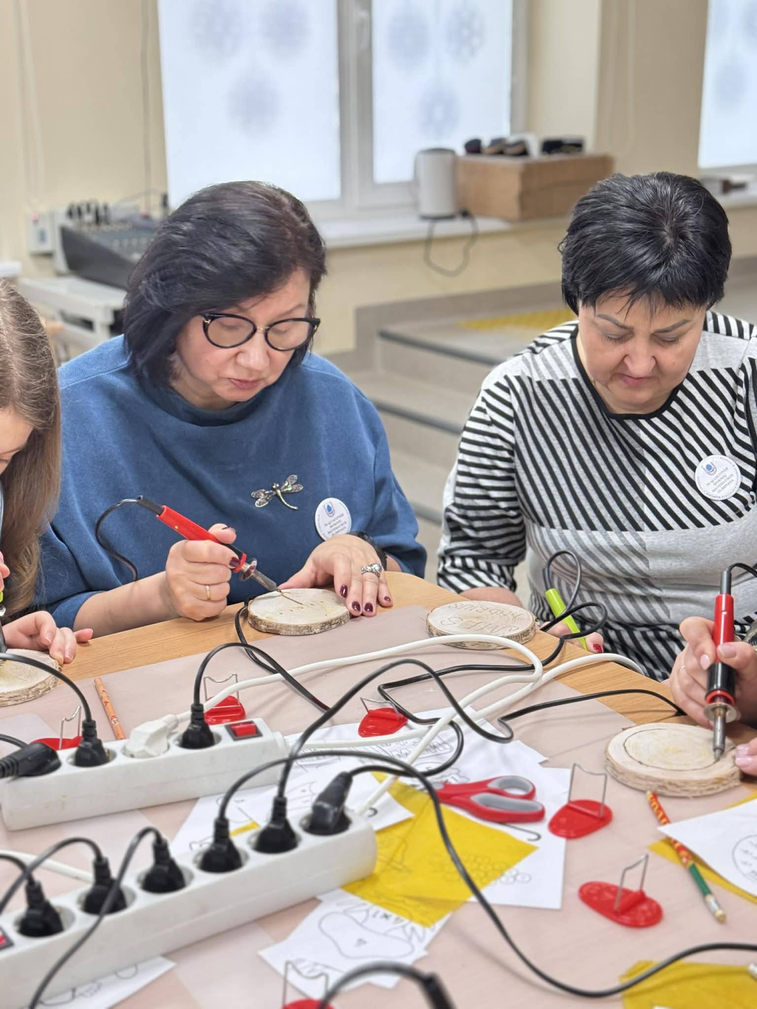 Kūrybinės dirbtuvės „Matematikos kodas: STEAM žinios ir patirtys“. Kol mokiniai sprendė olimpiados užduotis, mokytojai laiką leido ne mažiau turiningai. Pedagogams ir nepedagoginiams darbuotojams skirta veikla persipynė su STEAM metodika. Dalyviai praktiškai išbandė deginimą ant medžio, derindami tikslumą, technologijas ir meninę išraišką. Jų rankose gimė unikalūs padėkliukai kavai ir dekoracijos, kurios nuo šiol puoš matematikos kabinetą. Šis kūrybinis procesas tapo puikiu pavyzdžiu, kaip teorinės žinios gali virsti estetiškais ir praktiškais daiktais, o pokalbiai prie kavos puodelio leido sustiprinti kolegialų ryšį.