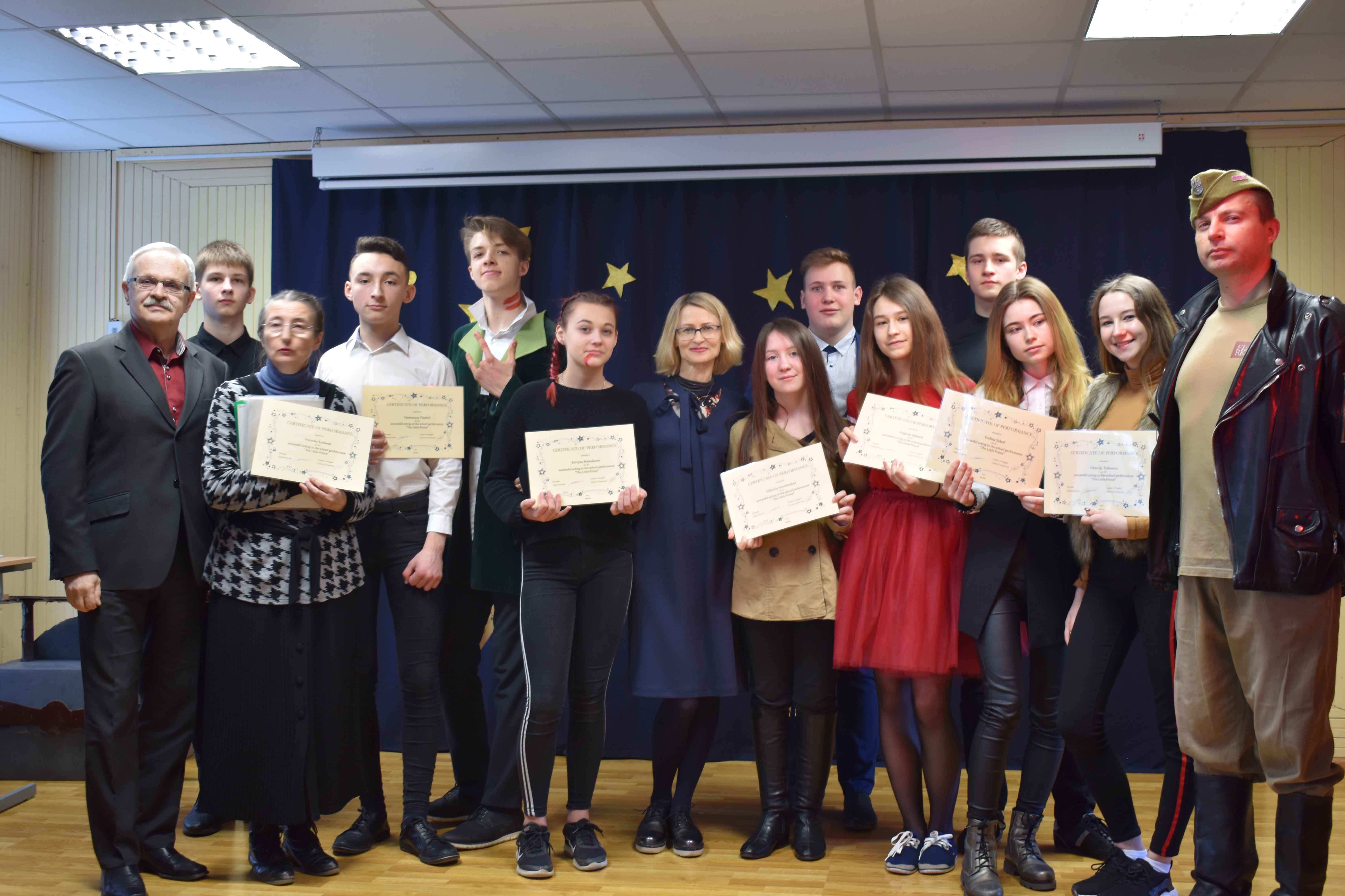 Uwieńczeniem całorocznej pracy było święto teatru w gimnazjum, które odbyło się 28 marca. W specyficznej atmosferze teatralnej uczniowie przedstawili swoją pracę w języku angielskim na scenie. Uczniowie klasy 4 wesoło zaprezentowali scenkę „Chicken Licken”, a uczniowie kl. IIG przedstawili spektakl „The Little Prince” na podstawie magicznej i poetyckiej opowieści „Mały Książę” Antoine de Saint-Exupery. W tym spektaklu brali udział nie tylko uczniowie, ale i nauczyciele ( nauczyciel historii Romuald Seniut i nauczycielka języka litewskiego Veronika Karkiene), którzy mieli możliwość wcielić się w odpowiednie role.