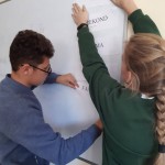 W tym roku uczniowie klas 5-8 oraz IG-IVG mieli niełatwe, ale interesujące zadanie. Każda klasa otrzymała słowo kluczowe w języku polskim. Należało znaleźć znaczenie tego słowa jeszcze w pięciu językach obcych wśród innych wyrazów, które zostały wypisane na kartkach i umieszczone na korytarzach gimnazjum. Następnie uczniowie umieścili te słowa na plakatach.