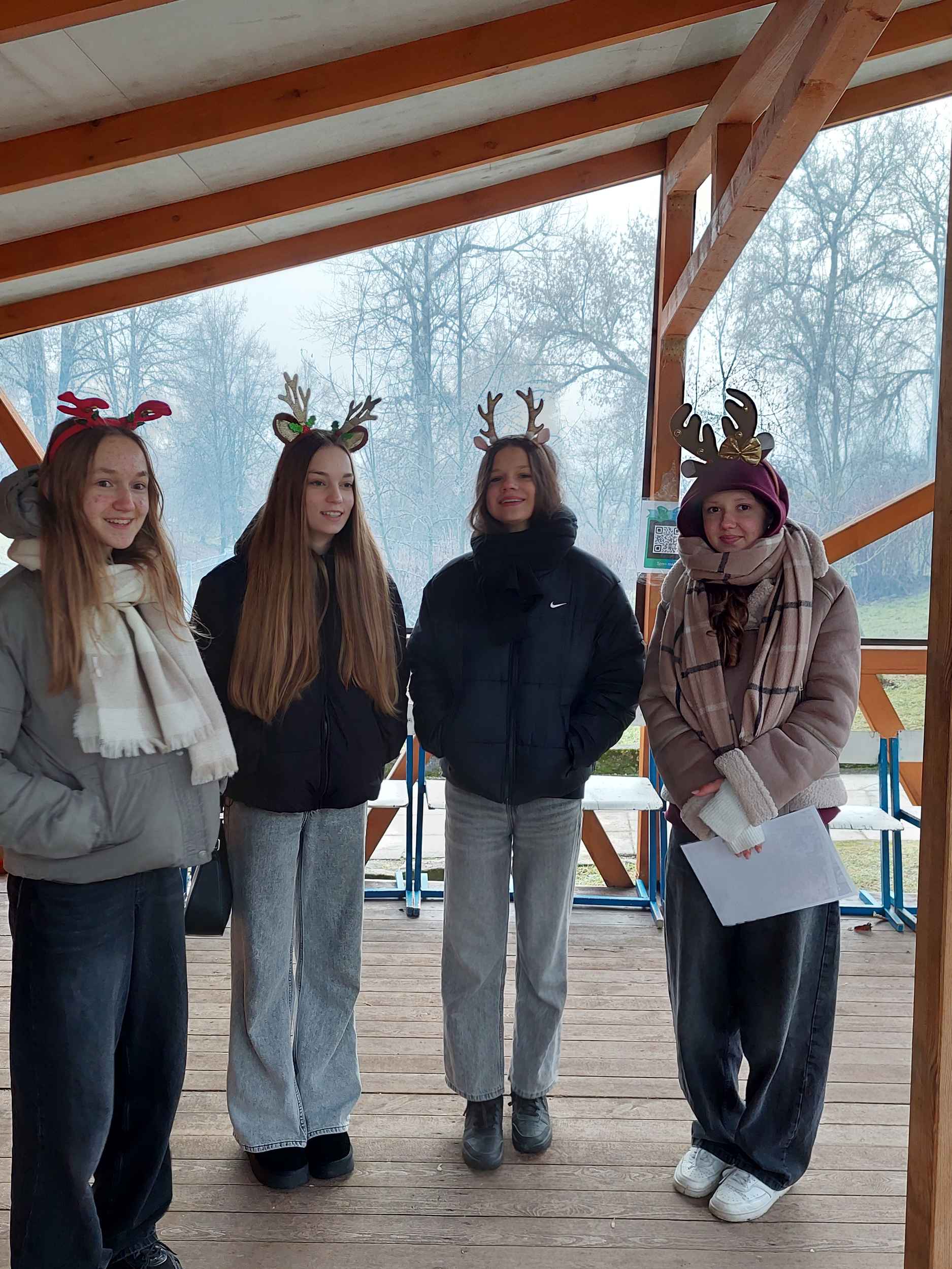 Korzystając z zaproszenia nauczycielki języka angielskiego w gimnazjum im. J. I. Kraszewskiego w Wilnie Olgi Nowickiej i uczniów 8b klasy, 19 grudnia uczniowie 8 klasy naszego gimnazjum wzięli udział w wyjątkowej, świątecznej lekcji terenowej, która połączyła naukę języka angielskiego z aktywną zabawą. Uczestnicy zostali podzieleni na międzyszkolne grupy, co sprzyjało integracji i współpracy między rówieśnikami. Zajęcia zostały zorganizowane w formie siedmiu stanowisk, z których każde oferowało inne zadanie. Na uczestników czekały zagadki językowe, pantomimy, śpiewanie piosenek po angielsku oraz wyzwania sprawnościowe, które wprowadzały w świąteczny nastrój i jednocześnie rozwijały różnorodne umiejętności.