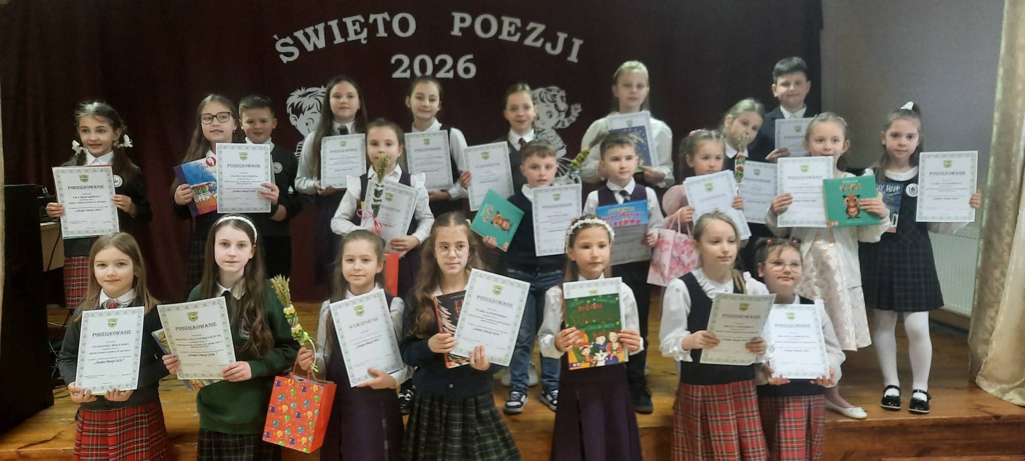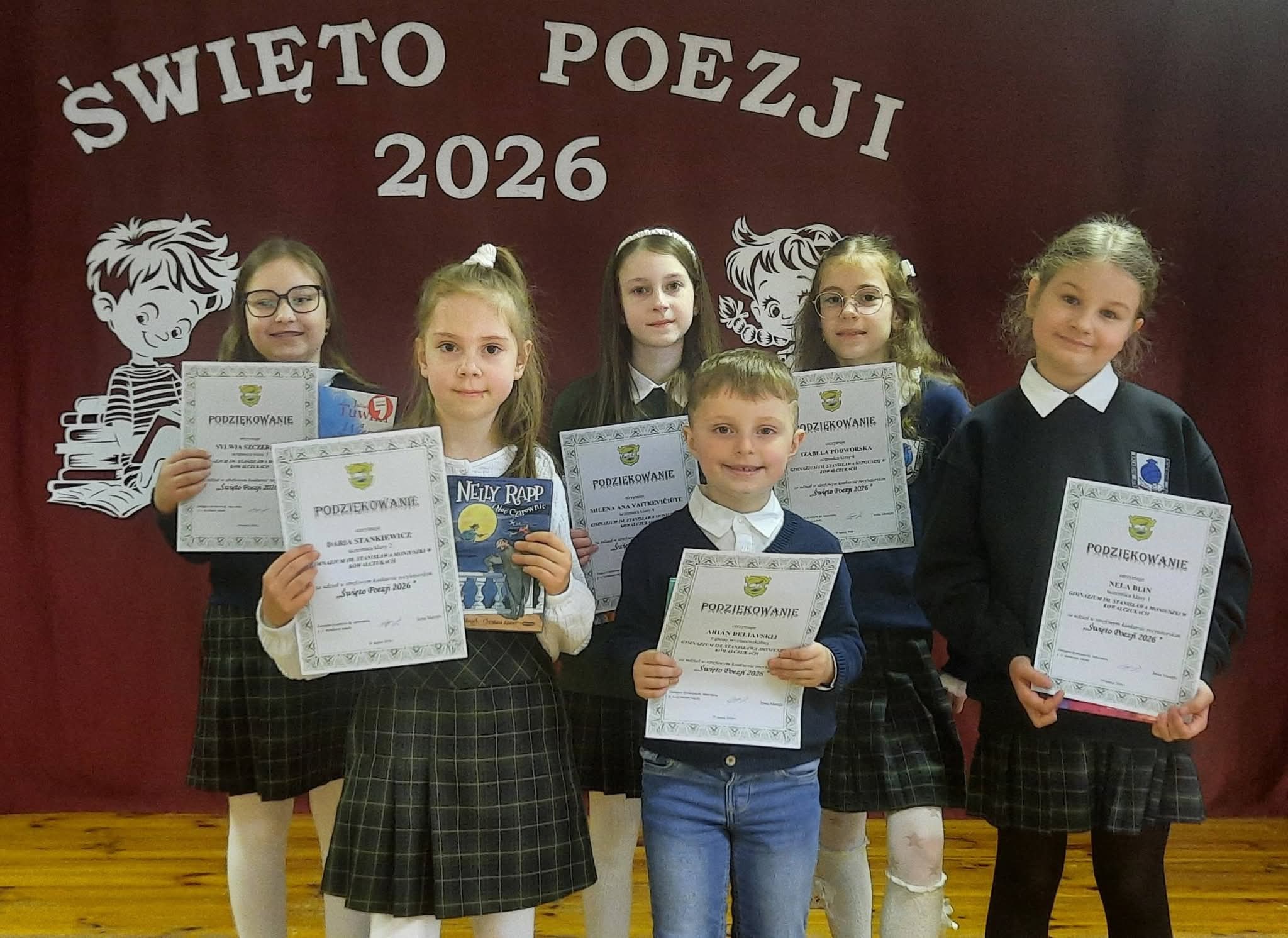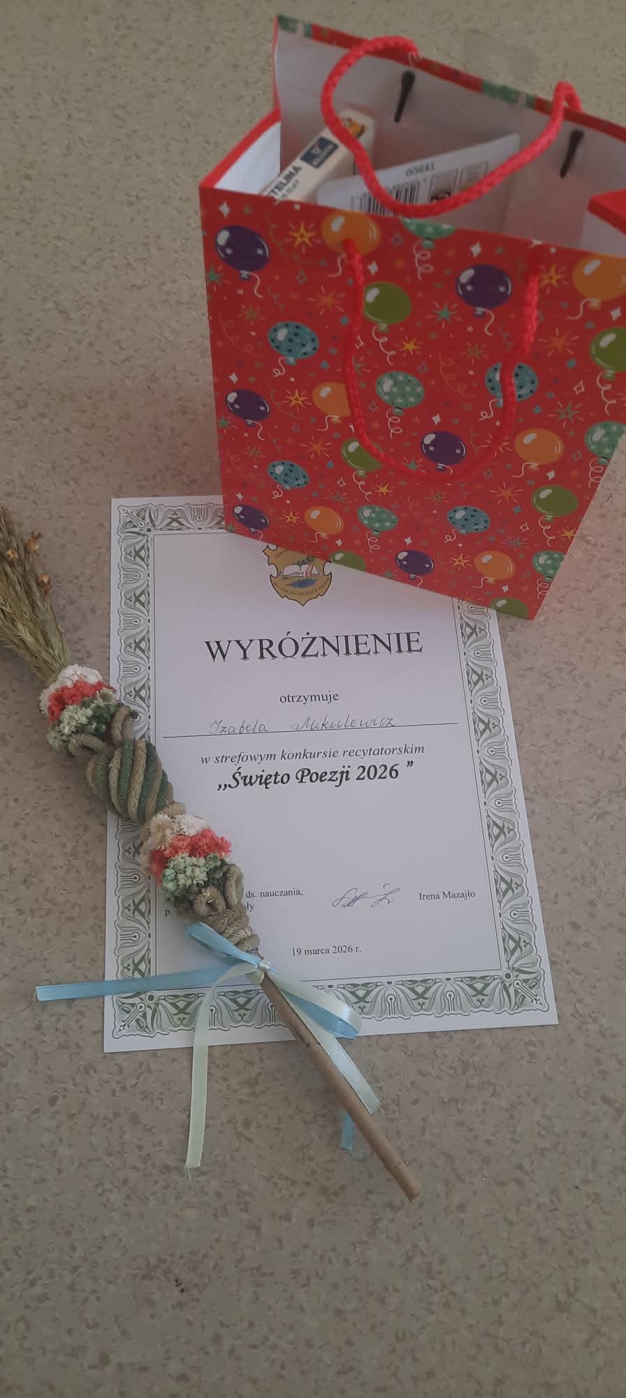 Z dumą informujemy, że uczniowie naszego gimnazjum: Adrian Beliawskij, Nela Blin, Izabela Mikulewicz, Daria Stankiewicz, Sylwia Szczerbuk, Izabela Podworska oraz Milena Ana Vaitkevičiūtė wzięli udział w strefowym konkursie recytatorskim „Święto Poezji 2026”.