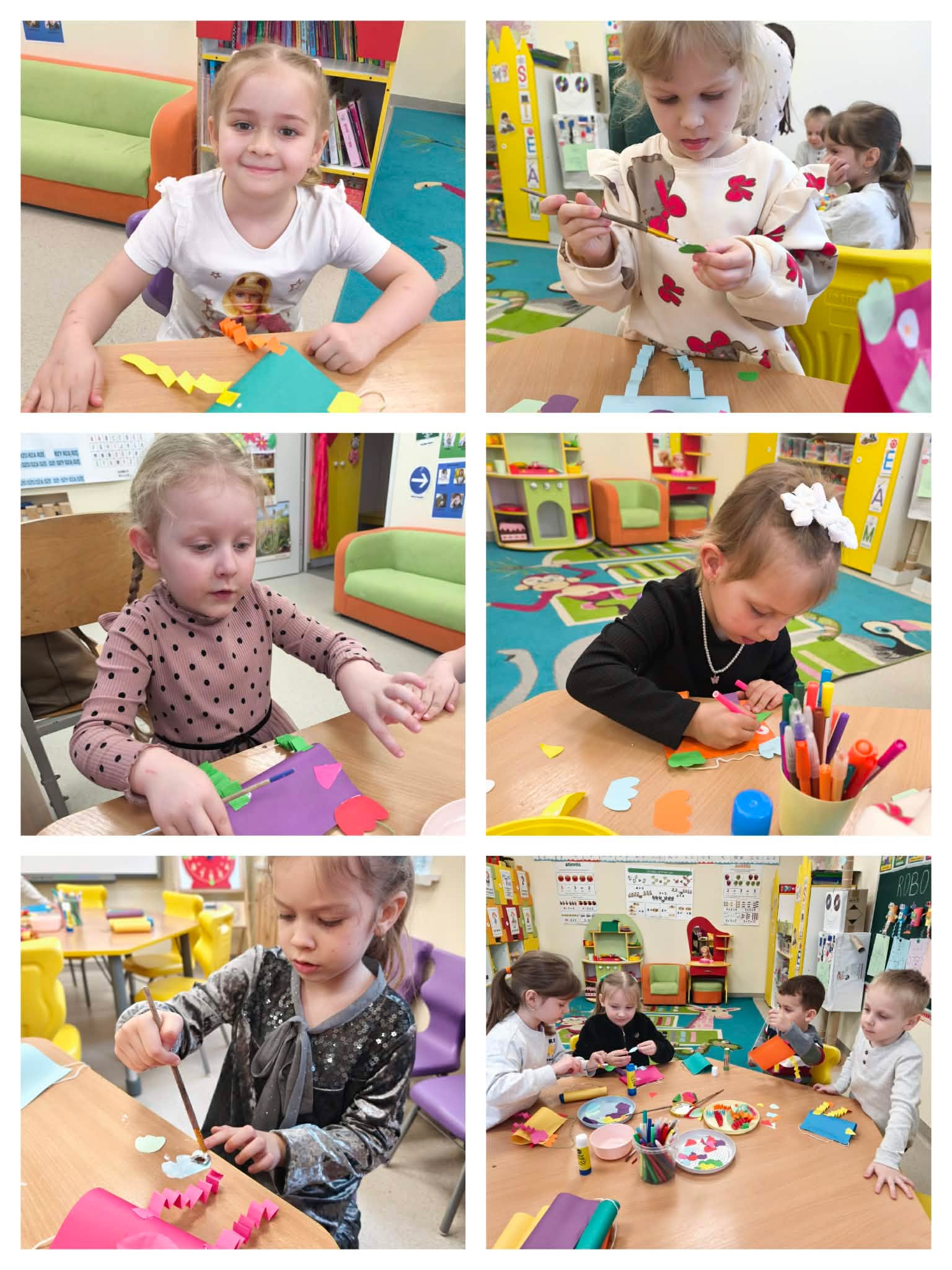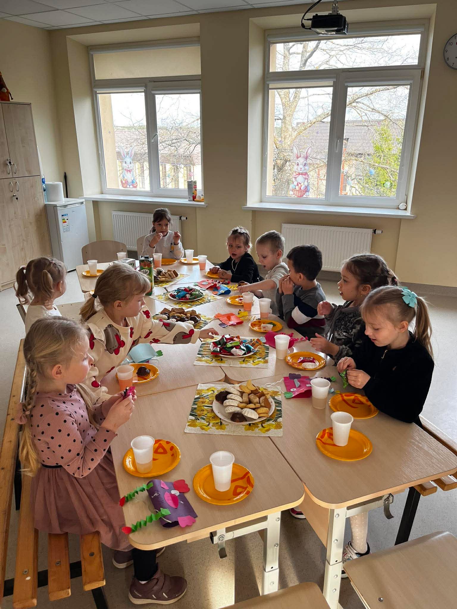 W dalszej części spotkania dzieci mogły wziąć udział w różnorodnych aktywnościach. Część z nich uczestniczyła w zajęciach plastycznych, podczas których powstawały prace nawiązujące do zbliżających się Świąt Wielkanocnych. Inni wybrali zajęcia ruchowe, które dostarczyły im wiele radości i pozytywnej energii. Wspólne działania sprzyjały integracji oraz tworzyły atmosferę pełną uśmiechu i życzliwości.
