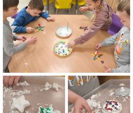- zdrowe odżywianie: Mali kucharze i naukowcy wykonywali doświadczenia związane z żywnością oraz tworzyli piramidy zdrowego odżywiania, by wizualnie zrozumieć zasady zbilansowanej diety. Kulminacją były degustacje owoców i warzyw oraz wspólne przygotowywanie sałatki warzywnej;