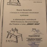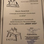 9 listopada odbył się XXXII Republikański Konkurs Recytatorski im. A. Mickiewicza „Kresy’ 2023”, w którym uczestniczyli uczniowie naszego gimnazjum Beata Szczerbuk i Dmitrij Filimonow. Przyszykowała nauczucielka Lucja Podworska. Gratulujemy Beacie Szczerbuk wyróznienia w konkursie.