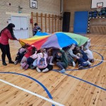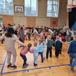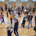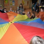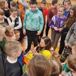 Po uroczystości nasi najmłodsi goście ruszyli „pociągiem” do dużej sali na zabawy. Na każdej „stacji” było wiele atrakcyjnych zabaw muzyczno-ruchowych. Przyszli uczniowie uczestniczyli również w różnych zabawach ruchowych z chustą animacyjną. Na ostatniej „stacji” czekała maluszków i ich rodziców miła niespodzianka. Był to słodki poczęstunek, a także upominki.